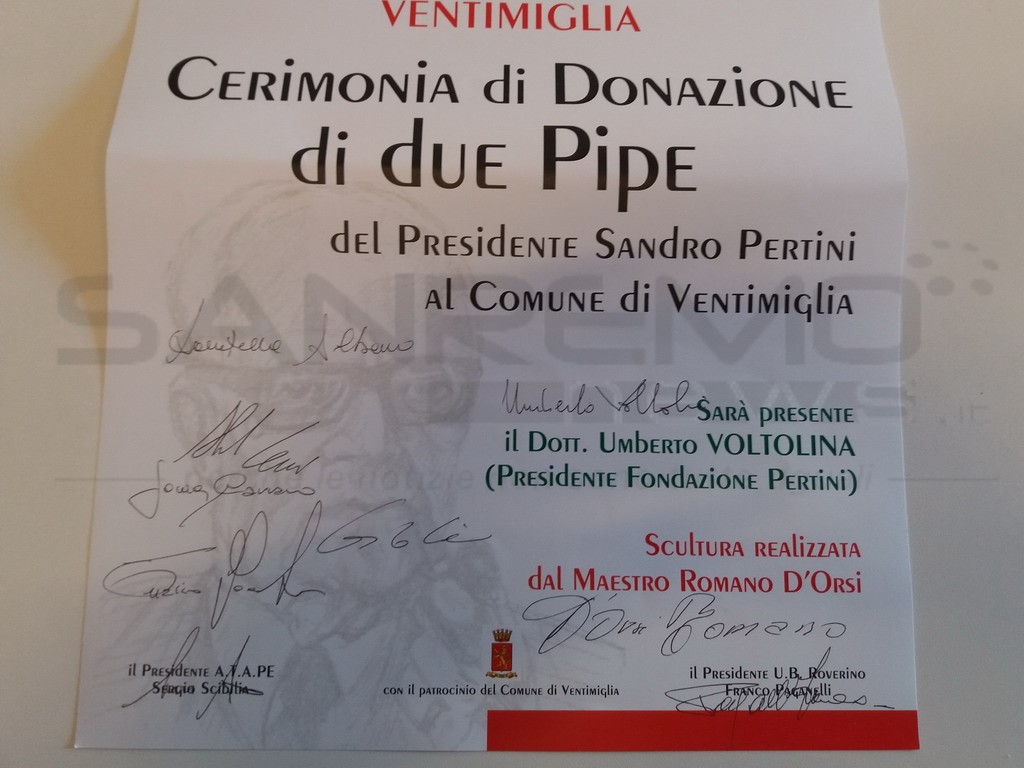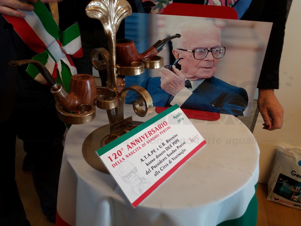 L’associazione ‘Atape’, in occasione della ‘Maratona Pertiniana’, ideata per commemorare il 120° anniversario della nascita del Presidente e per raccontare la vita personaggio storico del nostro Paese ha fatto tappa questa mattina alla biblioteca Aprosiana della città di confine. Insieme all’Unione Bocciofila Roverino ha deciso di donare al Comune di Ventimiglia due pipe originali appartenute a Sandro Pertini, Presidente della Repubblica e partigiano. Questi due preziosi oggetti sono provenienti dalla Fondazione Pertini e sono state consegnate personalmente dal Presidente Umberto Voltolina, una alla Unione Bocciofila Roverino nel settembre del 2015 nell'occasione della cerimonia di intitolazione del bocciodromo a Sandro e l'altra all’associazione transfrontaliera ‘Alessandro Pertini’ con cui collabora attivamente da diverso tempo.