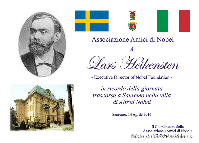 L'alto dirigente della Fondazione Nobel Lars Heikensten, ha ringraziato tutti i presenti per la splendida accoglienza e per quanto è stato fatto, un ricordo che porterà nel suo cuore e trasmetterà al Presidente e ai membri della Fondazione Nobel, della grande amicizia dei Sanremesi non solo per lo scienziato che ha creato e promosso i Premi Nobel, ma anche per l'onore e la simpatia dimostrata alla Nazione Svedese.