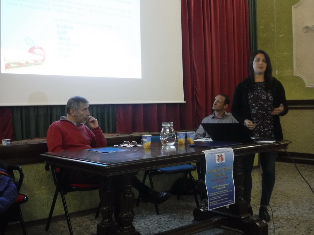 La parola è passata poi alla dott.ssa Irene Traverso, laureata in Dietistica presso l'università di Genova con numerose esperienze nel campo dell'alimentazione. La dott.ssa ha illustrato le caratteristiche principali dei componenti alimentari e delle diverse categorie alimentari e quelli che dovrebbero essere i consumi giornalieri consigliati per una sana e corretta alimentazione secondo la dieta mediterranea e la piramide alimentare. Ha poi portato a conoscenza del pubblico i principali errori che si commettono nell'alimentazione quotidiana e che possono compromettere lo stato di salute.