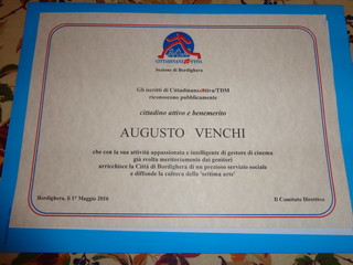 Oggi pomeriggio, Domenica 1° Maggio, all'apertura festiva del Cinema Olimpia di Bordighera, diversi cittadini appositamente convenuti hanno consegnato al Signor Augusto Venchi, titolare delle sale cinematografiche di Bordighera, un attestato col quale la Sezione Intemelia di Cittadinanzattiva gli riconosce pubblicamente la qualifica di cittadino attivo e benemerito che con la sua attività appassionata e intelligente di gestore di cinema, già svolta meritoriamente dai genitori, arricchisce la città di un prezioso servizio sociale e diffonde la cultura della 'settima arte'.