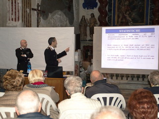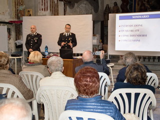 Ieri pomeriggio, alle ore 16.30, in Bordighera Alta, nell’oratorio di San Bartolomeo, davanti ad una nutrita platea di anziani, il Comandante della Compagnia di Bordighera, Cap. Lorenzo Toscano, ed il Comandante della Stazione, Maresciallo Raffaele Pace, hanno tenuto un incontro sul tema 'Prevenzione truffe in danno di persone anziane', durante la quale hanno illustrato quali sono le modalità con cui avvengono i più comuni raggiri e quali possono essere le strategie per prevenirli.