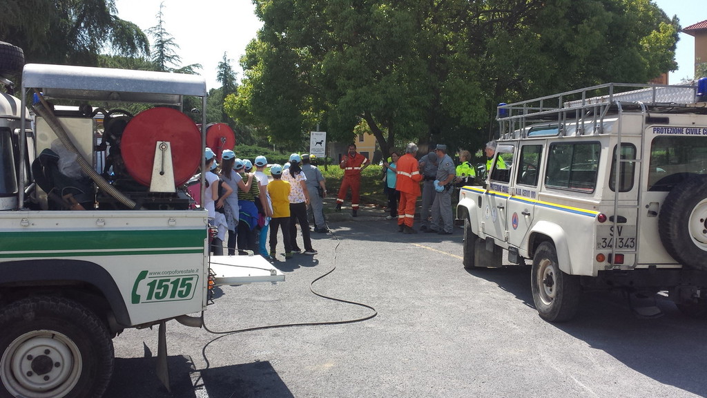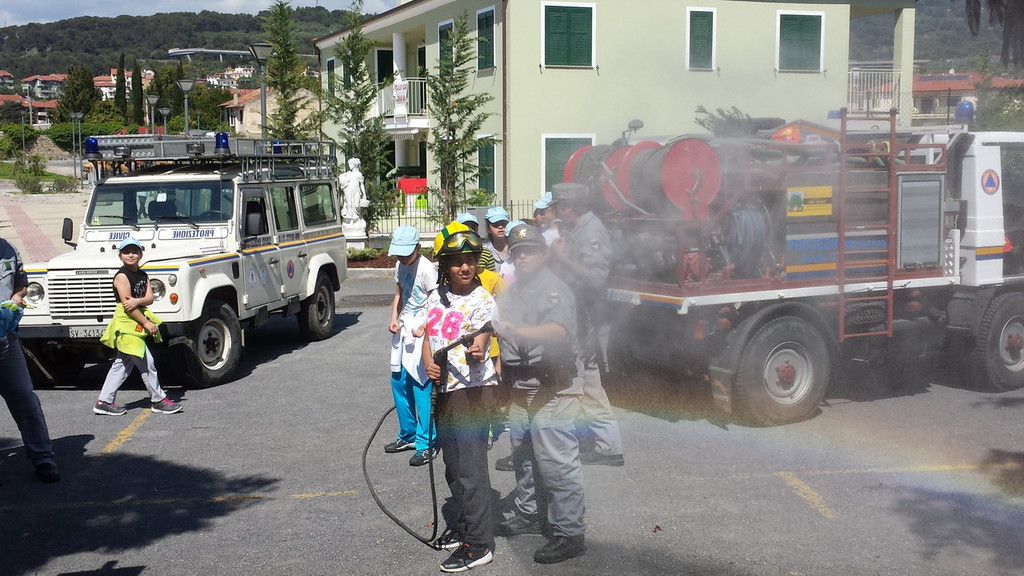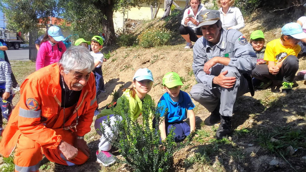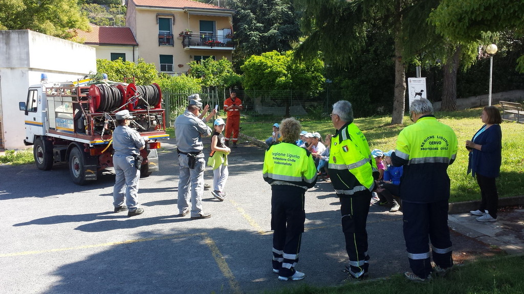 I volontari della Protezione Civile si occupano del settore terrestre che tratta i temi della prevenzione incendi e della tutela dell’ambiente con il progetto Salvaboschi della Regione Liguria. Un'altra lezione riguarda il tema della protezione civile volta a spiegare ai più piccoli il sistema di allertamento regionale in caso di maltempo, i rischi che si possono correre in caso di alluvione e terremoto. A fine progetto i volontari si sono recati nelle scuole di Cervo, dove gli alunni hanno provato i mezzi antincendio e con il CFS di Imperia si sono simulate alcune chiamate al numero operativo Regionale 800807047. Durante l'incontro i volontari hanno consegnato dei tesserini rilasciati dalla Regione Liguria sul tema del ‘salvabosco’ (Antincendio boschivo) e gli alunni della classe quinta hanno ricevuto un diplomino come premio simbolico a dimostrazione della fine del progetto, iniziato quando erano in quarta.