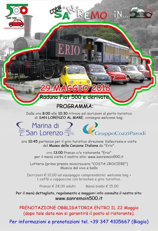Come ogni raduno, immancabile la parentesi culinaria con tappa da 'Erio' (via Roma 108, Vallecrosia) e dopo il pranzo, spazio al divertimento con musica dal vivo e ballo. Non mancherà la lotteria e il più fortunato potrà vincere una minicrociera Costa.