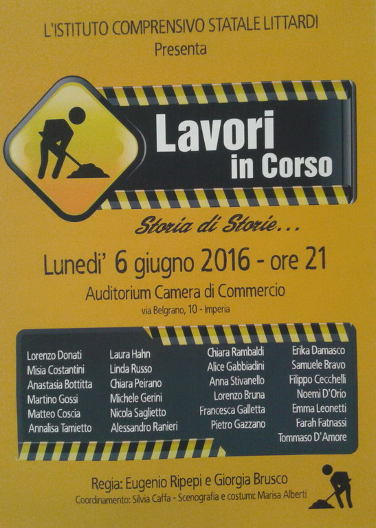Spiegano dalla scuola: “’Lavori in corso’, questo è il titolo dell'opera, ha un unico scopo, divertire e far ridere, possiamo per ora solo dirvi che sarà una Storia di Storie... non vogliamo dire altro per non rovinare la sorpresa, ma possiamo assicurarvi un lunedì sera emozionante e diverso dal solito. Un altro buon motivo per invitare il pubblico a passare lunedì sera con noi è lo scopo della serata, ovvero divertirsi aiutando gli altri, infatti Il ricavato dell’incasso la scuola lo devolverà in beneficenza. I biglietti sono acquistabili in prevendita presso la scuola media Littardi, o eventualmente presso l’auditorium il giorno stesso della serata al costo di 5 € (per ulteriori informazioni potete telefonare al numero 0183 660228).