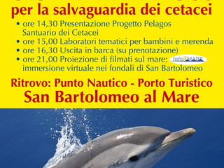 Interessante appuntamento per la promozione del Progetto Pelagos e per la salvaguardia dei cetacei, sabato a San Bartolomeo al Mare, dove l'ASD Krill Diving Club, con la collaborazione dell'Ufficio turismo e del Centro sociale Incontro propone una serie di eventi per tutte le fasce di età, onde consentire approfondimenti a vari livelli. Al Punto nautico del porto turistico sono infatti in programma appuntamenti, a partire dal primo pomeriggio fino a sera inoltrata. Si inizia alle 14:30 con la presentazione del Progetto Pelagos Santuario dei Cetacei, si prosegue alle ore 15:00 con i laboratori tematici per i bambini e i ragazzi (merenda a seguire) e alle ore 16.30 con l'uscita in barca (su Prenotazione); la giornata termina alle ore 21:30 con la proiezione di filmati sul mare e l'immersione virtuale nei fondali di San Bartolomeo al Mare.
