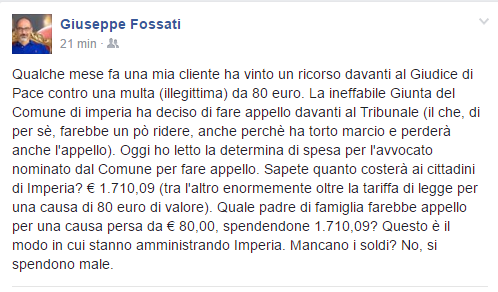 Imperia: "Il Comune spende quasi 2mila euro per l'appello a una multa di 80". L'accusa al vetriolo del capogruppo di Imperia Riparte Giuseppe Fossati