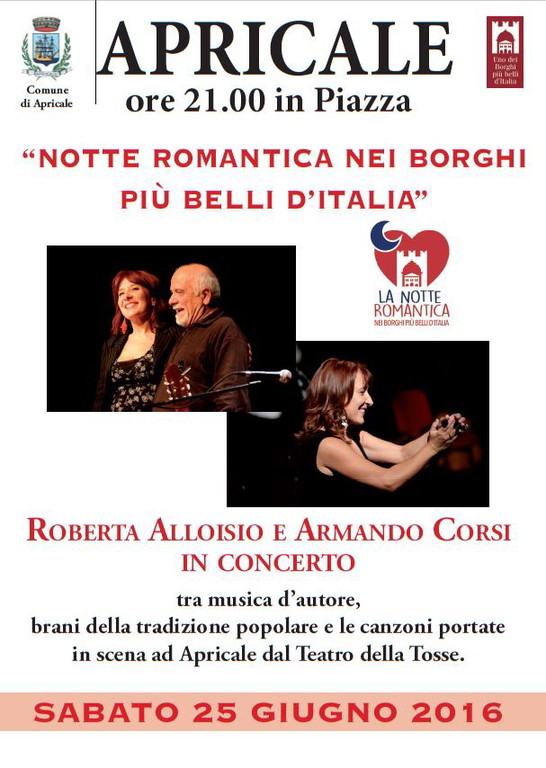 Sabato 25 giugno 2016 ad Apricale, alle ore 21.00 in Piazza, si celebra l’evento nazionale ‘Notte Romantica nei Borghi più belli d’Italia’ con il concerto di Roberta Alloisio e Armando Corsi tra musica d’autore, brani della tradizione popolare e le canzoni portate in scena dai due protagonisti del Teatro della Tosse.