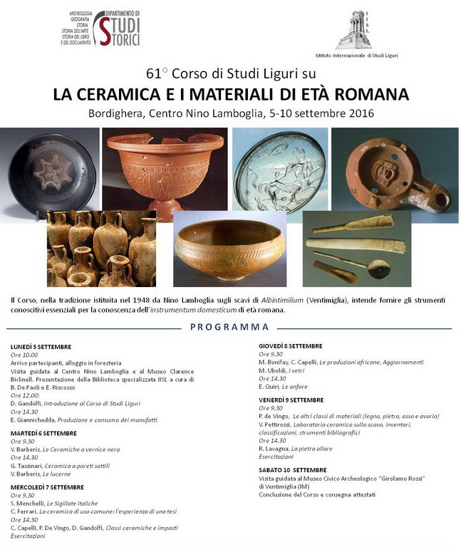 Sono aperte da questa settimana le iscrizioni al 61° Corso di Studi Liguri su “La ceramica e i materiali di età romana”, organizzato dall’Istituto Internazionale di Studi Liguri, in collaborazione con il Dipartimento di Studi Storici dell’Università degli Studi di Torino, presso il Centro Nino Lamboglia di Bordighera dal 5 al 10 settembre prossimi.
