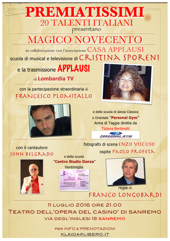 L’11 luglio, alle 21, al Teatro del Casinò di Sanremo arriverà lo spettacolo musicale “Premiatissimi”. Dopo un’accurata selezione svoltasi nell’arco di alcuni mesi, sono arrivati in finale ben venti talenti italiani, pronti ad emozionare la folta platea.