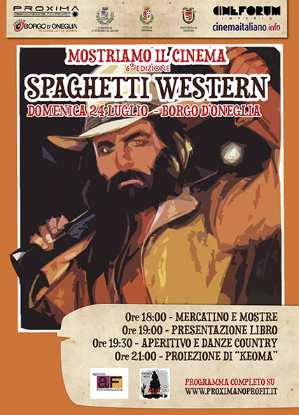 Sarà il cinema Western all’Italiana o, più semplicemente, lo “Spaghetti Western” il filo conduttore di questa sesta edizione di “Mostriamo il Cinema”. L’evento si svolgerà in due nuove location: il 16-23-24 luglio a Imperia Borgo d’Oneglia e dal 25 al 31 luglio a Santo Stefano al Mare. La manifestazione è organizzata da Proxima – Associazione no-profit e dal Circolo Borgo d’Oneglia, in collaborazione con CinemaItaliano.info e Cineforum Imperia, sotto il patrocinio del Comune di Santo Stefano al Mare, del Comune di Imperia e della Provincia di Imperia, con la direzione artistica di Marco Frassinelli.