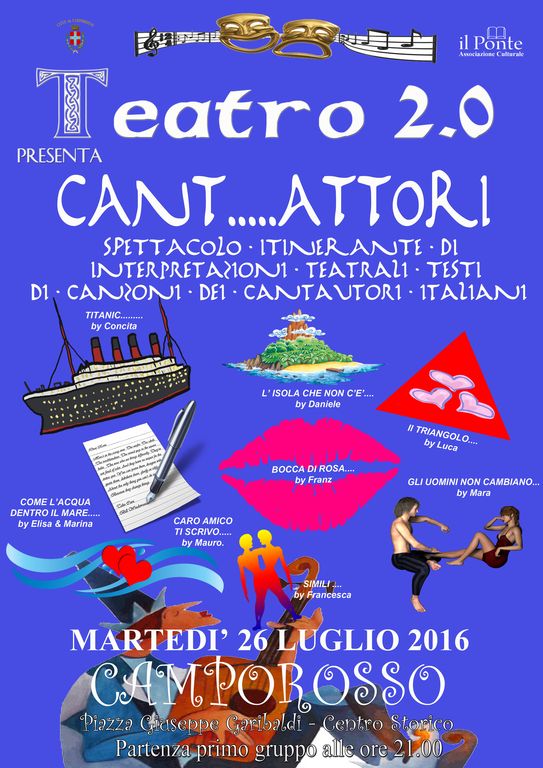 Questa sera 26 luglio alle ore 21,00 tra i vicoli e piazzette del centro storico di Camporosso, nell'ambito della rassegna estiva dell'assesorato al Turismo lo spettacolo itinerante “CANT.....ATTORI “, ovvero interpretazioni teatrali ispirate a testi di canzoni famose di cantautori e gruppi italiani messo in scena dalla nuova Compagnia Teatrale ponentina, TEATRO 2 punto Zero.