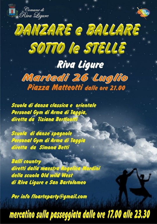 Questa sera a Riva Ligure in Piazza Matteotti a partire dalle 21 una serata all'insegna del ballo con ben tre scuole di danza che si esibiranno nelle rispettive discipline. Tutti i partecipanti alla manifestazione potranno assistere e ballare danze classiche e orientali, danze spagnole e il gettonatissimo ballo country. L'evento, patrocinato dal Comune di Riva Ligure, è stato organizzato da Floriana Lupano, responsabile dei collaterali mercatini dell'artigianato e dell'hobbistica.