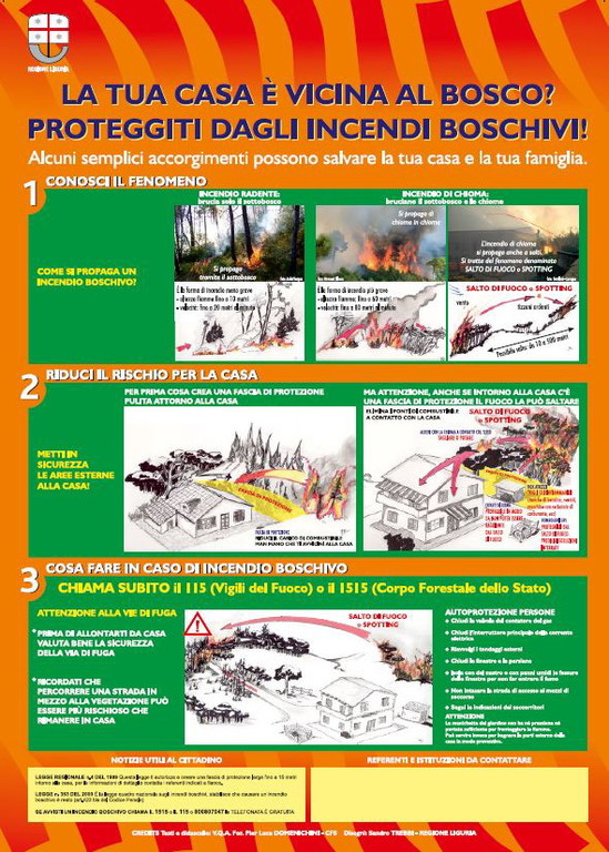 Inoltre ci sono alcuni accorgimenti utili da applicare per mantenere in sicurezza la propria casa, come per esempio mantenere una fascia di protezione pulita intorno alla propria dimora, e chiamare immediatamente il 115 Vigili dei Fuoco o il 1515 Corpo Forestale dello Stato in caso di incendio, facendo attenzione a chiudere il gas, spegnere la corrente elettrica, lasciare la strada libera per l’arrivo dei soccorritori.