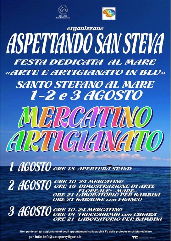 In vista dei festeggiamenti patronali di Santo Stefano al Mare, previsti per il 7 agosto, si apre una settimana all'insegna dei festeggiamenti. Il primo appuntamento è quello organizzato dalla ProLoco di Santo Stefano, con 3 date di mercatini: 1-2-3 agosto dal titolo “Aspettando San Steva, arte e artigianato in blu”. Perché in blu? Il riferimento è ovviamente alla bandiera blu ottenuta dal comune.