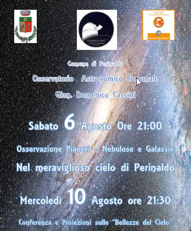 Il Comune di Perinaldo organizza due eventi che si svolgeranno all’Osservatorio Astronomico Comunale Cassini, entrambi incentrati sull’osservazione del nostro cielo e dei suoi tesori. Il primo appuntamento è fissato per questo sabato 6 agosto alle ore 21 con l’osservazione dei pianeti, delle nebulose e delle galassie mentre mercoledì 10 agosto, notte di S. Lorenzo, alle ore 21:30 si terrà una conferenza e proiezioni sulle “Bellezze del Cielo” a cura di Franco Bertucci, a seguire osservazione delle Stelle Cadenti.