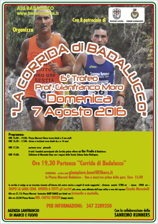 Anche quest'anno si rinnova il tradizionale appuntamento con la Corrida di Badalucco. L'evento giunto alla sesta edizione si terrà oggi, domenica 7 Agosto 2016 e sarà intitolata al prof. Gianfranco Moro.