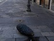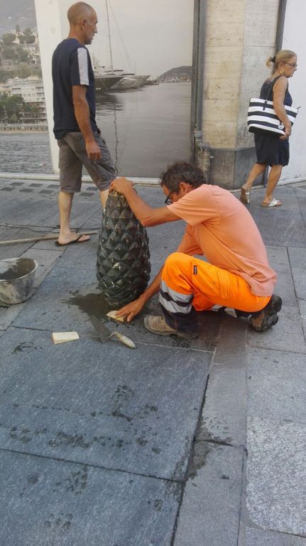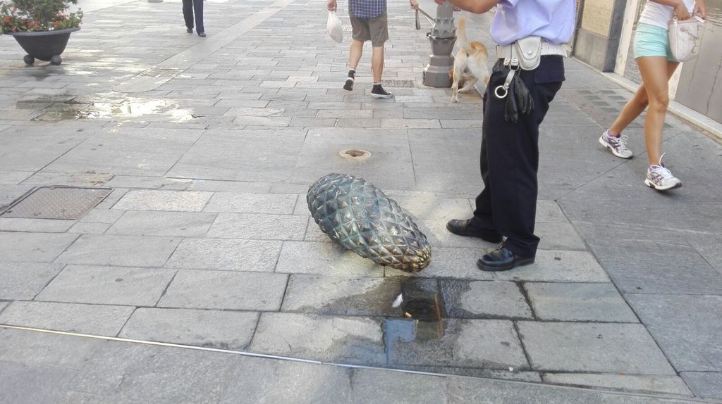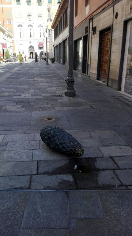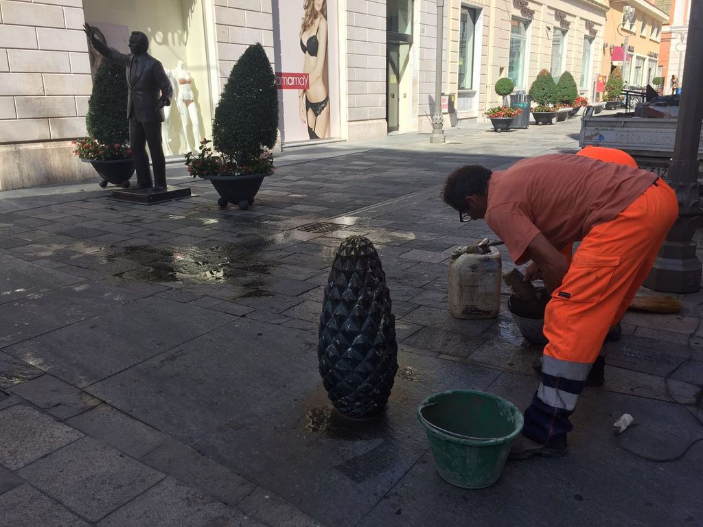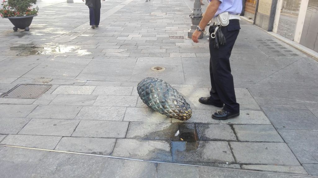 Questa mattina sono state numerose le segnalazioni agli agenti della municipale che, intervenuti sul posto hanno richiesto l'intervento dell'ufficio viabilità, il quale ha rimesso la pigna in piedi, collocando sul basamento un pò di cemento.