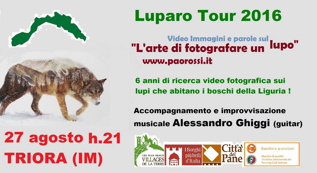 Sabato 27 agosto, alle ore 21.00, il 'Centro Culturale Polivalente La Strega' di Triora ospiterà una tappa del Luparo Tour 2016 con una proiezione dal titolo 'L’arte di fotografare un Lupo' – sei anni di ricerche video fotografiche sui Lupi che abitano i boschi della Liguria.