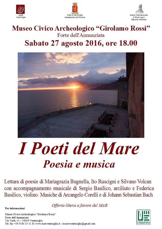 Domani Sabato 27 Agosto alle ore 18.00 presso la nuova Terrazza del Museo Civico Archeologico ”G.Rossi” (Forte dell'annunziata) di Ventimiglia, andrà in scena la rassegna poetico-musicale , “I poeti del mare”: lettura di poesie di Mariagrazia Bugnella, Ito Ruscigni e Silvano Volcan, con l'accompagnamento musicale di Sergio Basilico all'Arciliuto e Federica Basilico al Violino. Le musiche presentate sono di Arcangelo Corelli e J.S. Bach.