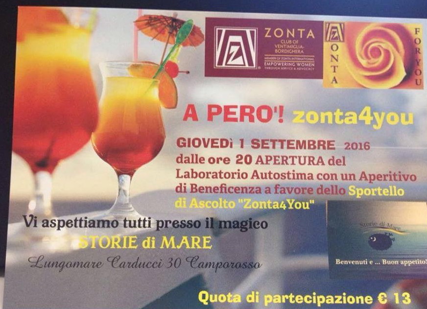 Le volontarie di ‘Zonta4you’ si preparano alla riapertura delle serate Autostima con un apericena di beneficenza che si terrà domani sera alle 20, presso il locale ‘Storie di Mare’, in lungomare Carducci a Camporosso.