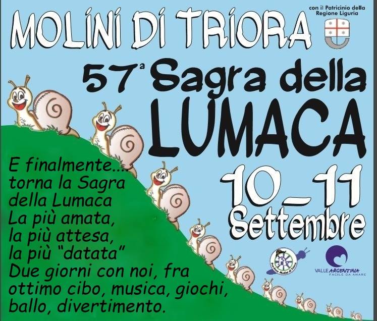 Si parte il 10 settembre con la sagra della lumaca di Molini di Triora, giunta alla 57ma edizione. “Il secondo fine settimana di settembre, come da tradizione, tornerà la Sagra della Lumaca, per la gioia di quanti la attendono tutto l'anno! Tanto buon cibo, con distribuzione delle lumache già al sabato sera; tanta musica con Simona e gli Eclipse (sabato e domenica nell'area ristoro). E poi, domenica, si mangia e si balla, ma in giro per il paese troverete la musica e la simpatia degli Spunciaporchi e poi giochi, truccabimbi, intrattenimenti e attività per i bimbi. E per unire l'area "pappa" al paese, ci sarà un trenino turistico gratuito a disposizione del pubblico!” - sottolineano gli organizzatori.