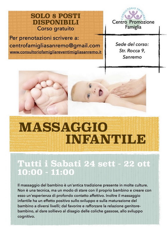 Inizieranno il 24 settembre i 5 incontri gratuiti dedicati al massaggio infantile, organizzati dal Consultorio Familiare Centro Promozione Famiglia.