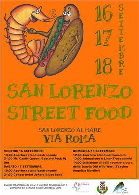 Tutto pronto a San Lorenzo al Mare per esordio questa sera di una manifestazione dedicata allo street food organizzata dal Civ - Il Giardino di Magdala in Via Roma, nella zona denominata anche come Campetto Feste. Si potrà mangiare e degustare prodotti tipici di qualità, provenienti anche da particolari zone d'Italia a partire da venerdì 16 fino a domenica a pranzo, comodamente seduti. Tra i piatti protagonisti gli Hamburger di Fassona piemontese, Arrosticini abruzzesi, Frittura di Pesce, Panini vari, Crèpes, Birra artigianale, Cocktail e molto altro ancora. Gli stand gastronomici apriranno Venerdì 16 settembre a partire dalle ore 19.00 e alle ore 21.30 la serata sarà animata dalle note di Mr Castle Queen, Bastard Rock Dj Set. Nella serata successiva invece si potrà mangiare accompagnati dalla musica della Jokers Blues Band. La manifestazione si concluderà domenica 18, con un pranzo tutto dedicato a grandi e piccini, con animazione, truccabimbi con Lindy e a partire dalle ore 14.00 esibizione di bally country con Old Wild West e la scuola di ballo capitanata da Angelica Mordini.