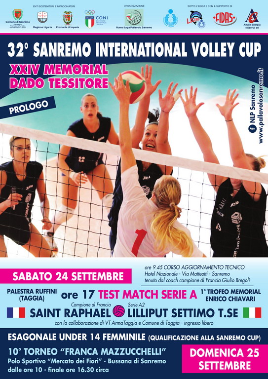 Sono ben tre i weekend su cui si articola quest'anno la Sanremo Cup Memorial Dado Tessitore, manifestazione internazionale di pallavolo giunta alla 32esima edizione, la prima senza colui che per anni ne è stato l'anima Enrico Chiavari. E proprio allo storico presidente della Nuova Lega Pallavolo Sanremo, per decenni figura di riferimento del volley nella Città dei Fiori, sarà dedicato il prologo dell'evento, il test match di serie A femminile tra la squadra che ha vinto l'ultimo titolo di Francia, il Saint Raphael, ed il Lilliput Settimo Torinese, formazione che si appresta a disputare il secondo campionato di A2. L'incontro è fissato per sabato 24 settembre, con inizio alle ore 17, presso la palestra Ruffini di Taggia.