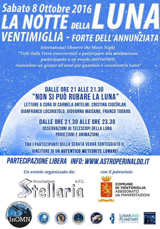 Per questa importante occasione l’Associazione Stellaria vi aspetta dalle 21 alle 23.30 al Forte dell’Annunziata di Ventimiglia, per una serata dedicata al nostro satellite con osservazioni ai telescopi, proiezioni, letture di racconti e poesie e la possibilità di essere sorteggiati e tornare a casa con un piccolo granello di Luna proveniente da un autentico meteorite lunare!