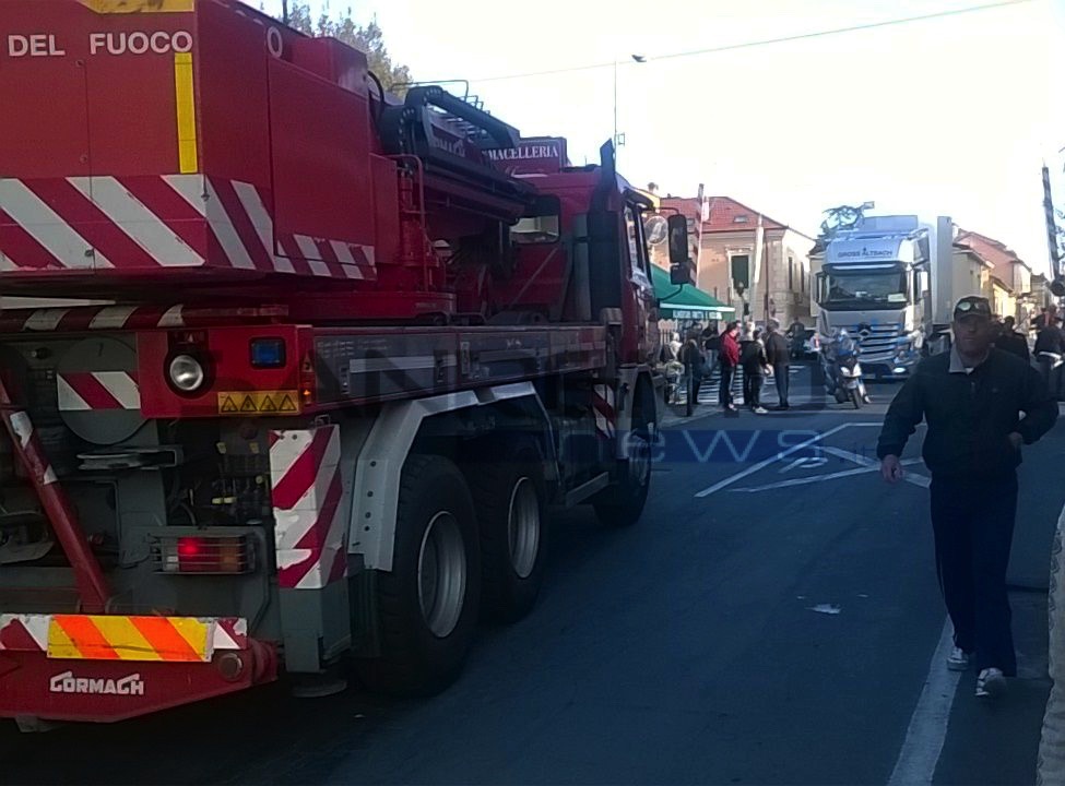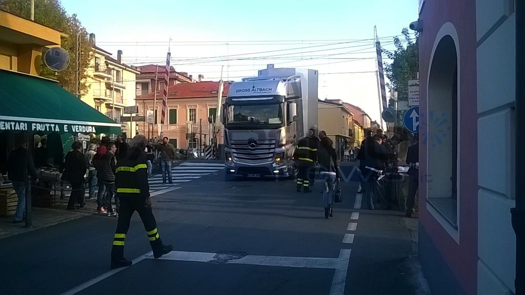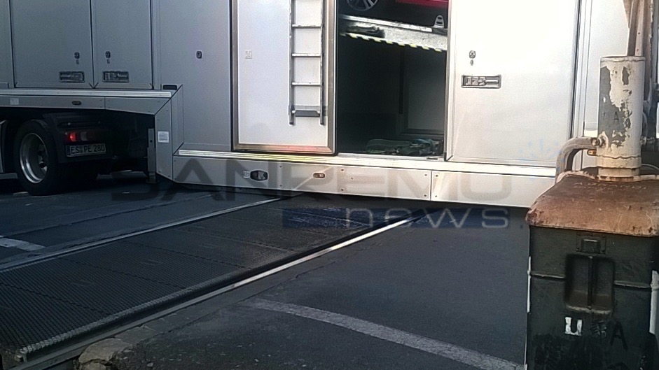 Diano Marina: tir della Mercedes incastrato tra i tralicci al passaggio a livello. Treni fermi per un'ora (foto e video)