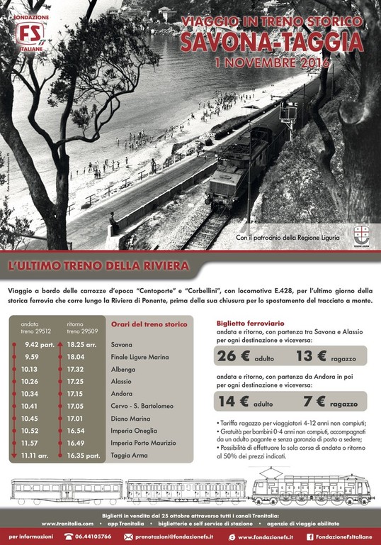 L’iniziativa - una collaborazione tra Fondazione FS Italiane e Regione Liguria - porterà per l’ultima volta un convoglio d’epoca sui binari che, la notte successiva all’evento, saranno abbandonati per sempre, dopo ben 144 anni ! La nuova tratta, quasi totalmente in galleria, entrerà in funzione l’11 dicembre prossimo, con l’adozione dell’orario 2016/2017.