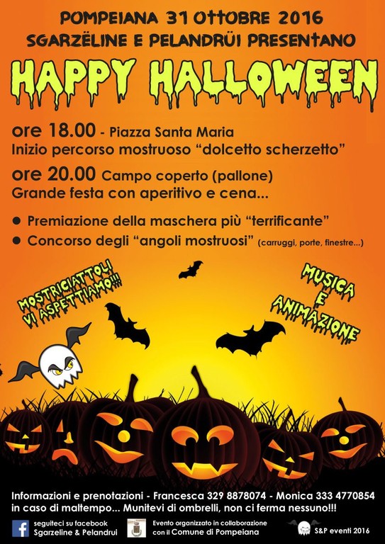 Un Halloween mostruosamente a misura di mamme, papà e bambini, venite a bussare alle porte da brivido dei carruggi di Pompeiana, anche se piove non importa, bastano ombrello e mantella e la festa non si ferma. Evento realizzato da Sgarzeline e Pelandrui con la collaborazione del Comune di Pompeiana, per informazioni potete chiamare Francesca al 329-8878074 e Monica al 333-4770854.