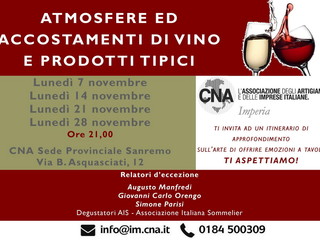 CNA invita ad un nuovo itinerario di approfondimento sull’arte di offrire emozioni a tavola dal titolo ‘Atmosfere ed accostamenti di vino e prodotti tipici’. Gli incontri si terranno presso la sede di Sanremo, in Via B. Asquasciati 12 (Piazza Colombo), sempre a partire dalle ore 21 nelle seguenti serate: