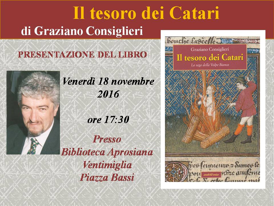 Sarà dedicato al romanzo storico “Il tesoro dei Catari – La saga della Volpe Bianca”, scritto dal giornalista Graziano Consiglieri ed edito da Araba Fenice, il prossimo appuntamento culturale della Biblioteca Aprosiana di Ventimiglia. L'appuntamento è previsto nella sala di piazza Bassi venerdì prossimo dalle 17.30, avrà come ospite l'autore che sarà presentato e intervistato da Lucilla Borio, dell'Ecovillaggio Torri Superiore.