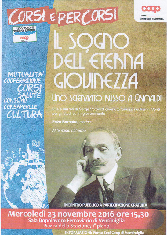 Mercoledì 23 novembre, alle ore 15.30, al Dopolavoro Ferroviario in p.le Stazione a Ventimiglia si terrà una conferenza intitolata "Il sogno dell'eterna giovinezza. Uno scienziato russo a Grimaldi". L'iniziativa è organizzata da Coop Liguria per 'Corsi e Percorsi'. Nel corso della conferenza saranno proiettate numerose immagini d’epoca per parlare di Serge Voronoff.