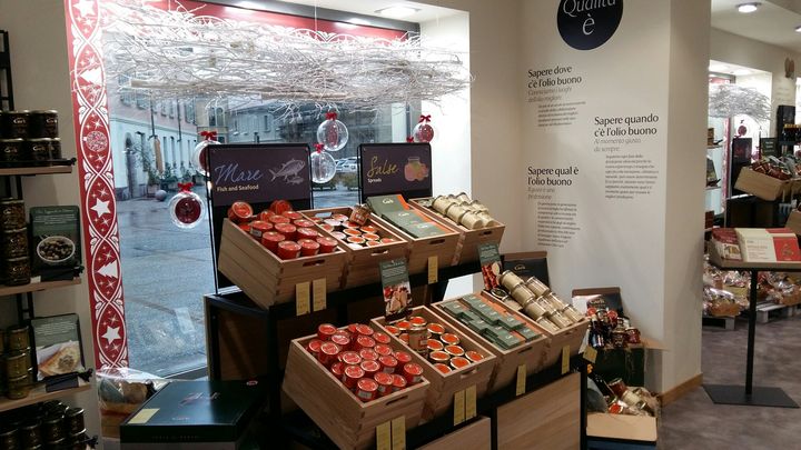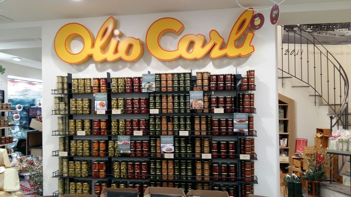 Sugli scaffali trovano posto tonno, verdure sott'olio, olive, peperoncini ripieni, pesto fresco e sughi pronti, pasta fresca, liscia o ripiena, tortini freschi salati che cambieranno nel corso dell’anno a seconda della verdura di stagione disponibile. E poi ancora vini, aceti, dolci e golosità in cui il burro è stato sostituito dall'olio, creme di frutta e mieli. Non mancheranno cesti e pacchi dono pensati per le festività natalizie e, per finire, cosmetici e saponi a base di olio.