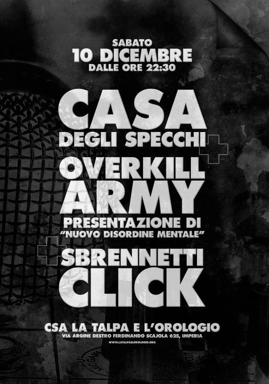 Sabato sera dalle 22 alle 2 a La Talpa e l'Orologio il live di Casa degli specchi & Overkill army & Sbrennetti click.