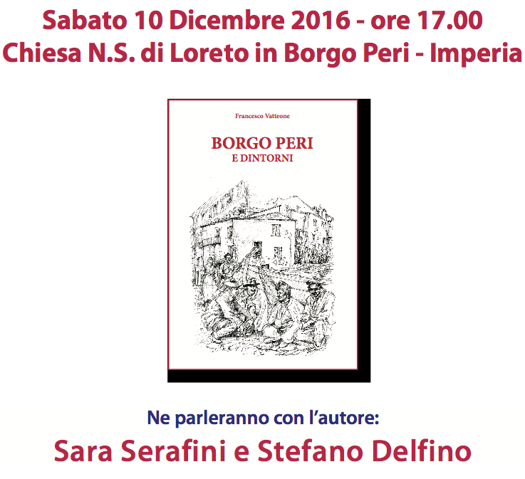 Sabato 10 dicembre alle ore 17 ad ingresso libero nella chiesa di Nostra Signora di Loreto a Borgo Peri in Imperia si terrà la presentazione dl libro di Francesco Vatteone "Borgo Peri e dintorni". Ne parleranno con l'autore Sara Serafini e Stefano Delfino.