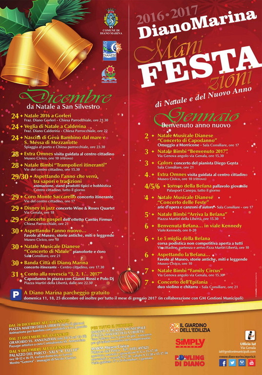 Per tutte le informazioni sulla città e per conoscere quanto accade anche nei dintorni, sino a sabato 7 gennaio è aperto l’Ufficio Iat di via Genala, a fianco della Chiesa Parrocchiale, con orario dalle 9 alle 12, ad esclusione delle domeniche. Ivi sono disponibili copie del pieghevole di tutte le manifestazioni, stampato realizzato con il supporto di Arimondo Supermercati Simply ed Eurospin, Bowling di Diano e Il Giardino dell’Edilizia.