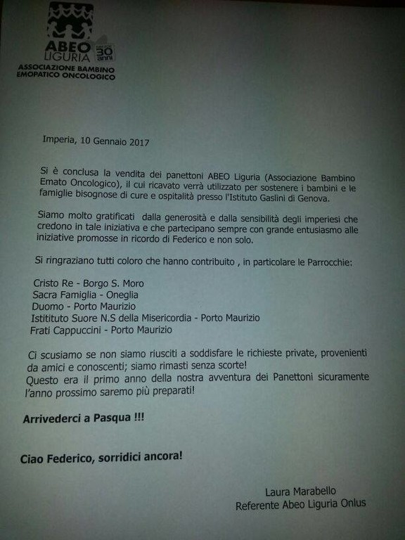 "Siamo molto gratificati dalla generosità e dalla sensibilità degli imperiesi - evidenziano gli organizzatori - che credono in tale iniziativa e che partecipano sempre con grande entusiasmo alle iniziative promosse in ricordo di Federico e non solo. Ringraziamo tutti coloro che hanno contribuito, in particolare le Parrocchie: Cristo Re - Borgo S. Moro, Sacra Famiglia - Oneglia, Duomo - Porto Maurizio, Istitituto Suore N.S della Misericordia - Porto Maurizio e Frati Cappuccini - Porto Maurizio Ci scusiamo se non siamo riusciti a soddisfare le richieste private, provenienti da amici e conoscenti; siamo rimasti senza scorte! Questo era il primo anno della nostra avventura dei Panettoni sicuramente l’anno prossimo saremo più preparati!"