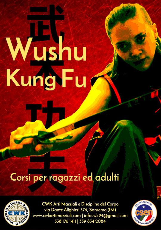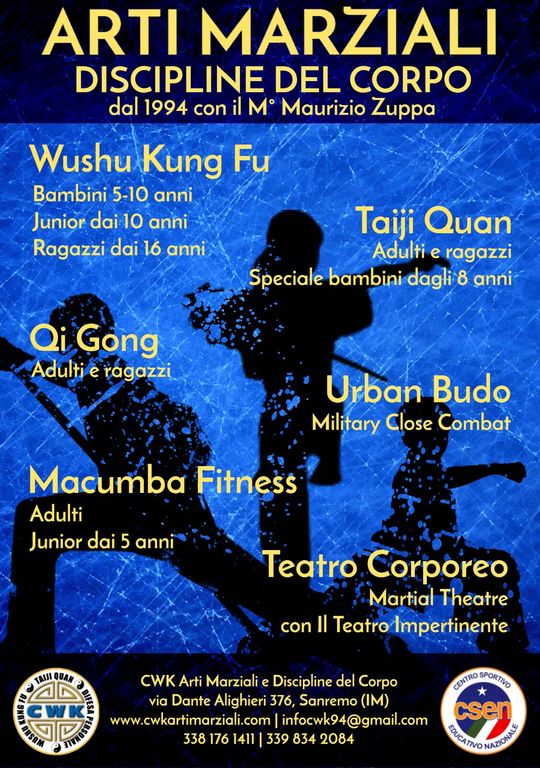 Sono riprese ufficialmente le lezioni della palestra di Arti Marziali Cinesi CWK di Sanremo, situata in via Dante Alighieri 376. Forte dei suoi ventitré anni di esperienza, successi, riconoscimenti e grandi ospiti, il direttore tecnico Maurizio Zuppa e il suo staff vi aspettano con le novità di quest'anno, con gli obiettivi di sempre: miglioramento dello stato generale di salute, mantenimento della forma psicofisica e sviluppo dei valori e delle risorse umane dell'individuo.