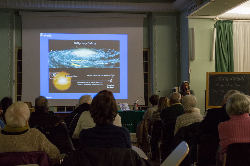 La lezione è stata tenuta dalla Professoressa Marina Muzi, ex responsabile dell'osservatorio di Perinaldo e attualmente membro del direttivo dell'associazione Stellaria, associazione che si occupa di divulgazione e didattica riguardo l'astronomia, o come ha detto durante la lezione “Stellaria si occupa di condividere l’arte dei mondi sconosciuti”. Prima di parlare del sole, la professoressa ha brevemente spiegato come il nome della Galassia, la Via Lattea, nasca dalla mitologia classica, che vede il latte di Giunone alle basi della Galassia, e come essa fosse rappresentata nelle varie culture antiche.