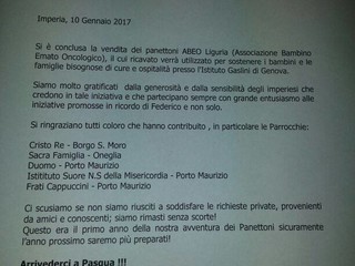 "Siamo molto gratificati dalla generosità e dalla sensibilità degli imperiesi - evidenziano gli organizzatori - che credono in tale iniziativa e che partecipano sempre con grande entusiasmo alle iniziative promosse in ricordo di Federico e non solo. Ringraziamo tutti coloro che hanno contribuito, in particolare le Parrocchie: Cristo Re - Borgo S. Moro, Sacra Famiglia - Oneglia, Duomo - Porto Maurizio, Istitituto Suore N.S della Misericordia - Porto Maurizio e Frati Cappuccini - Porto Maurizio Ci scusiamo se non siamo riusciti a soddisfare le richieste private, provenienti da amici e conoscenti; siamo rimasti senza scorte! Questo era il primo anno della nostra avventura dei Panettoni sicuramente l’anno prossimo saremo più preparati!"