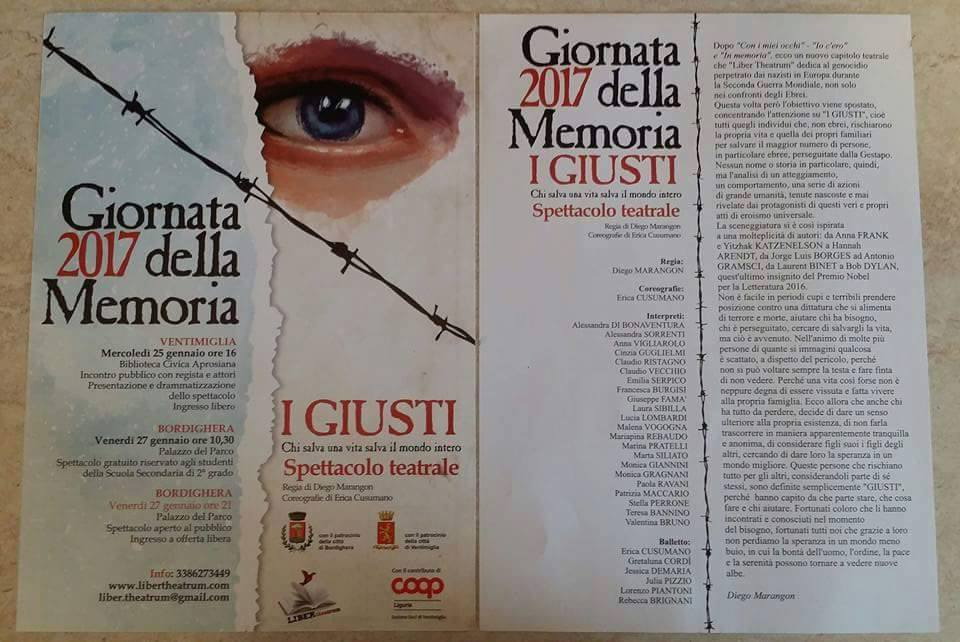 Ultimi e intensi giorni di prove per l'Associazione Culturale "LIBER theatrum" ancora protagonista anche per le celebrazioni nell'estremo ponente ligure della "Giornata della Memoria 2017" con tre momenti distinti, sempre ad ingresso libero, dedicati al ricordo dell'Olocausto e della Shoah, il tutto con il patrocinio e il sostegno della Città di Bordighera, oltre che della Città di Ventimiglia e il contributo di Coop Liguria Sezione Soci di Ventimiglia.
