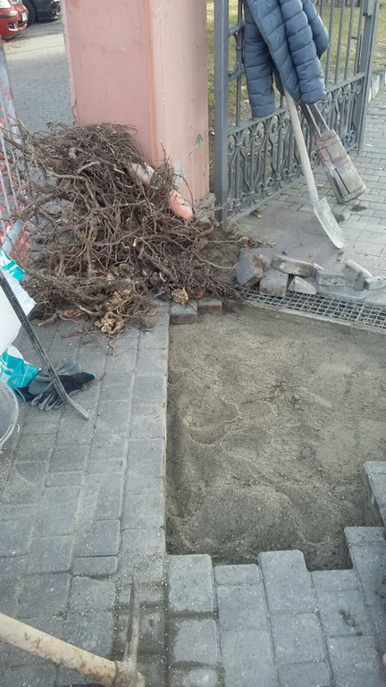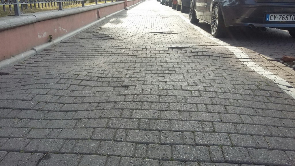 In questo caso non si tratta di pavimentazione vecchia, ma di problemi di sollevamento del manto pedonale dovuto alla presenza di radici sottostanti. La crescita di queste radici ha prodotto dei piccoli dossi che possono creare dei disagi al pedone; si sta procedendo al riposizionamento delle piastrelle e al livellamento.