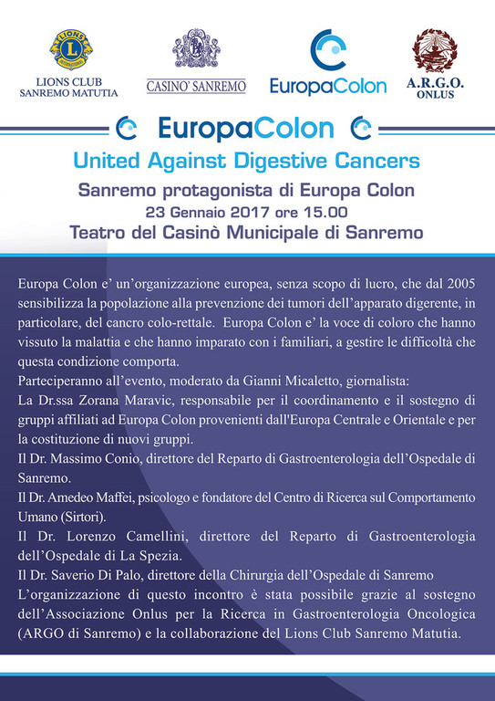 Il Sindaco Alberto Biancheri ha fatto gli onori di casa, ai relatori e al numeroso pubblico, sottolineando l’importanza che questa iniziativa riveste per Sanremo. Infatti il noto medico sanremese, Massimo Conio, primario del reparto di gastroenterologia dell’ospedale cittadino, è stato incaricato di costituire la sezione italiana di Europa Colon.