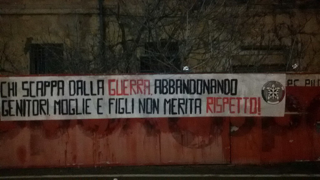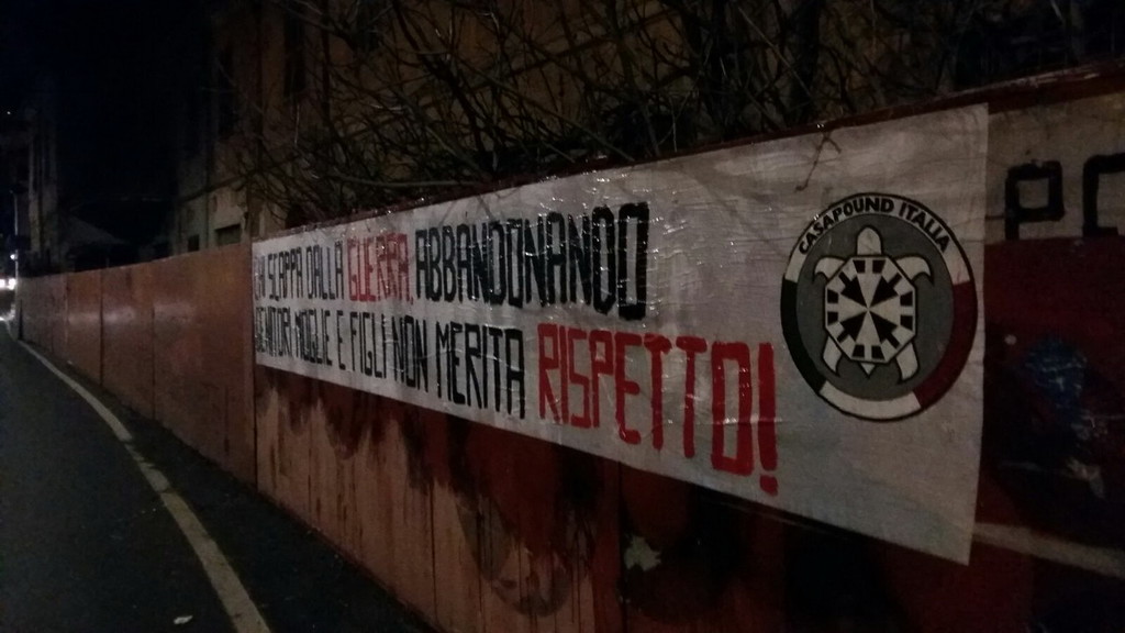 “Chi scappa dalla guerra, abbandonando genitori, moglie e figli non merita rispetto!”. E’ questo il testo degli striscioni a firma CasaPound Italia spuntati questa mattina in un centinaio di città italiane dal nord al sud del paese, tra cui Imperia.