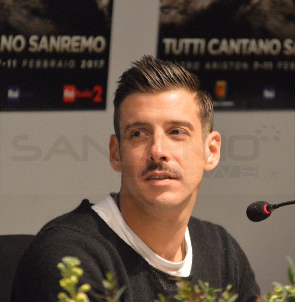 In gara con Occidentali’s Karma, Francesco Gabbani arriva a sorpresa in conferenza in Sala Lucio Dalla del Palafiori di Sanremo (a seguito dell’annunciato annullamento delle scorse ore).