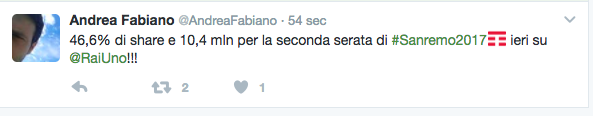 Il consueto cinguettio del direttore di Rai1 Andrea Fabiano annuncia i dati relativi agli ascolti della serata del Festival di Sanremo. La seconda della kermesse si chiude con il 46,6% di share e 10,4 milioni di telespettatori.