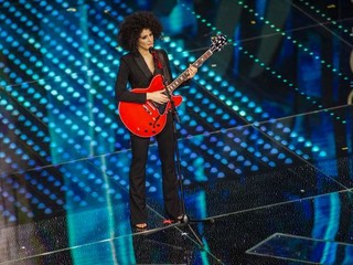 Marianne Mirage Chitarra rossa che spezza il nero del completo con scollatura profonda, trucco quasi impercettibile a sottolineare gli occhi e chioma ribelle. Voto 6,5